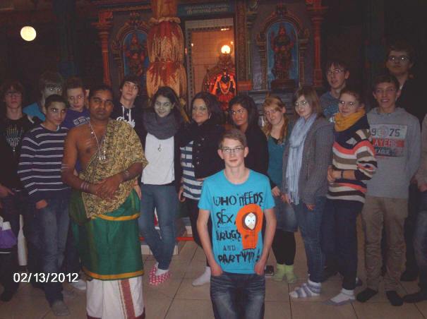 Gemeinsam mit dem katholischen und evangelischen Religionskurs nahmen Schülerinnen und Schüler aus dem Kurs der praktischen Philosophie an einer Exkursion zum Hindu-Tempel Sri Kamadchi Ampal nach Hamm teil. Sichtlich beeindruckt waren Liane, Elvira, Sarah, Hanan, Loreen und Laura von den großen bunten Bildern verschiedener Götter, z. B. lernten sie Vishnu kennen, einen strahlenden, jugendlichen Gott mit vier Armen, der die Erhaltung der Weltordung verkörpert.